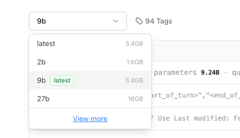 Tip: To try different floating point models, click the ‘View More’ link on Ollama.